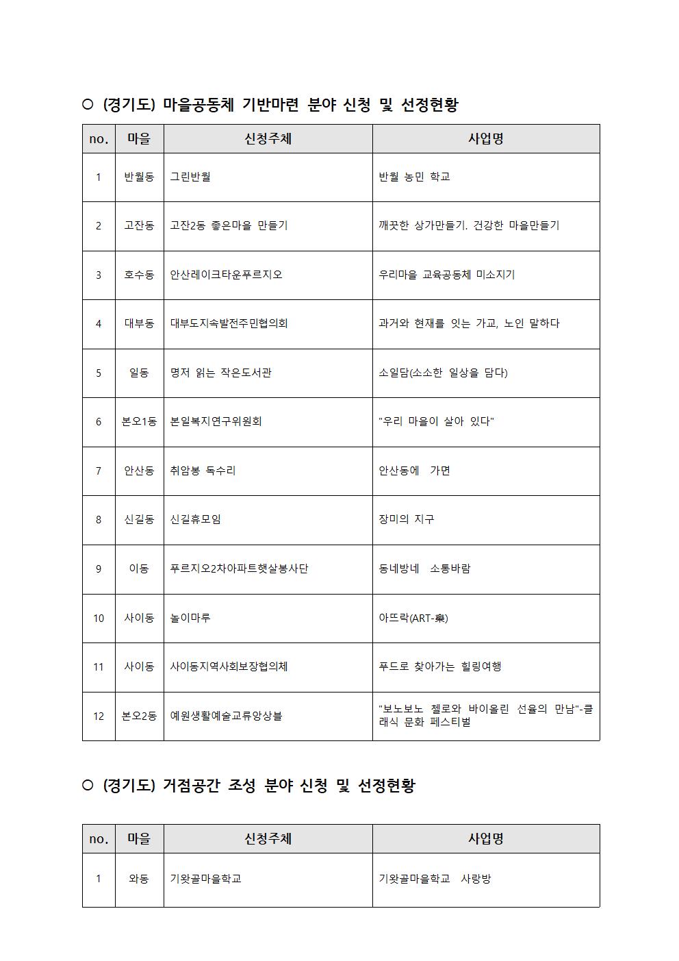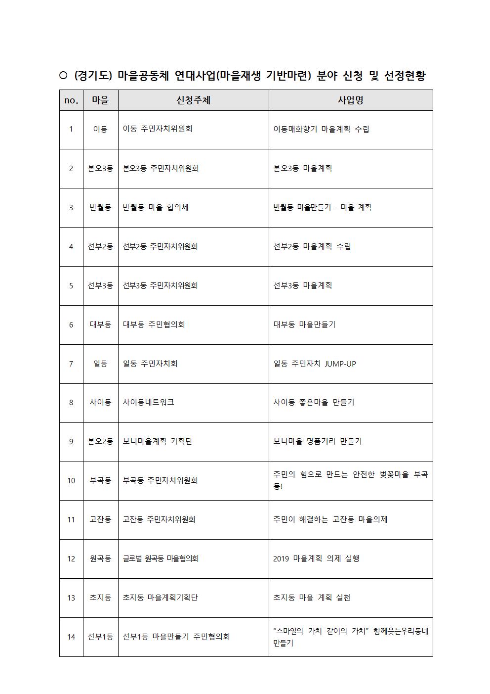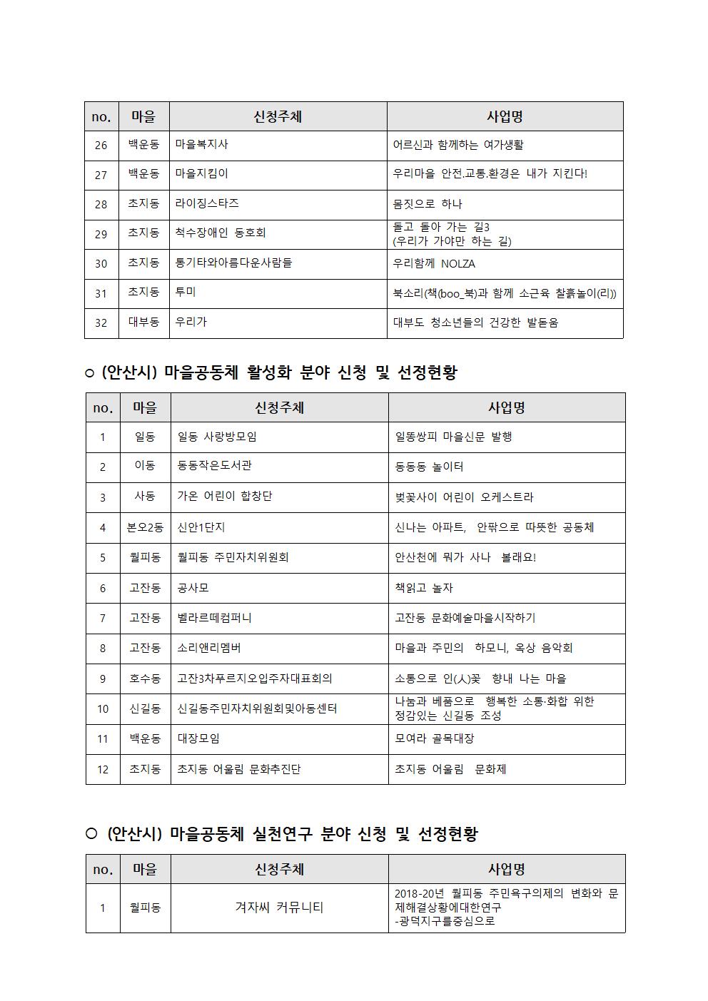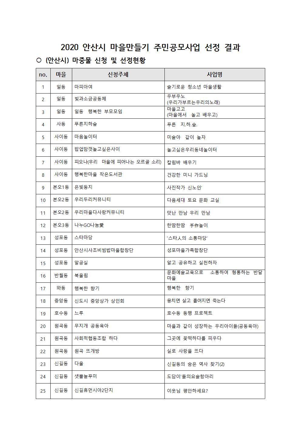 공고[2020-13호] 2020년 안산시 마을만들기 주민공모사업 선정결과