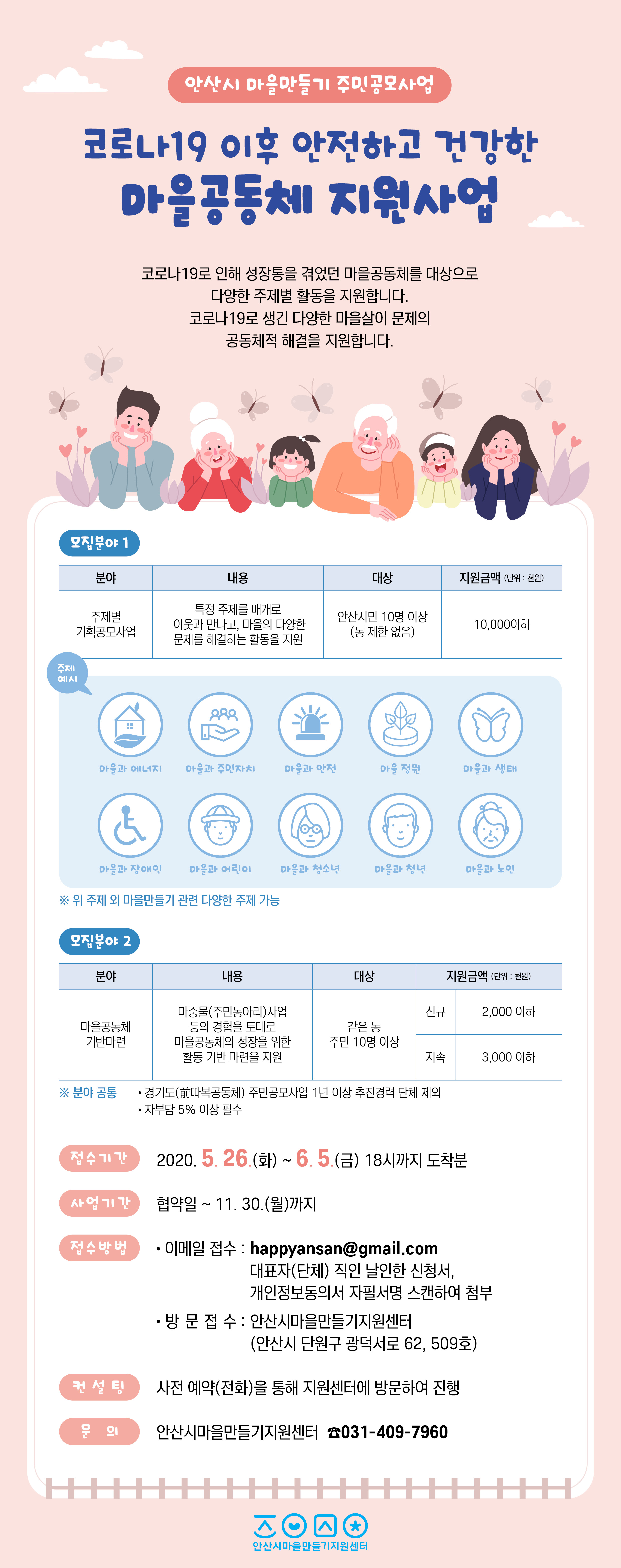 2020년 제3차 안산시 마을만들기 주민공모사업은 경기도 마을공동체 주민제안 공모사업만 진행합니다.