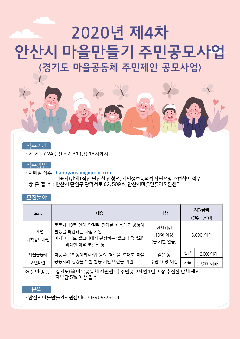 2020년 제4차 안산시 마을만들기 주민공모사업은 경기도 마을공동체 주민제안 공모사업만 진행합니다.