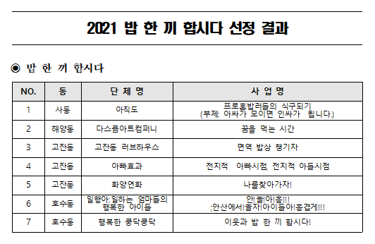 공고[2021-9호] 2021년 밥 한 끼 합시다 사업 선정결과