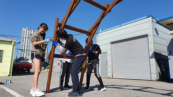 ‘마을숲통나무’ 꿈의학교 학생들이 4·16재단을 찾아 협업을 통해 돔 구조물을 제작하고 있다.