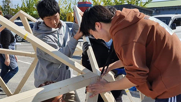 학생들이 4·16재단에서 돔 구조물을 제작하고 있다.