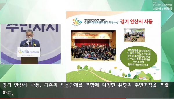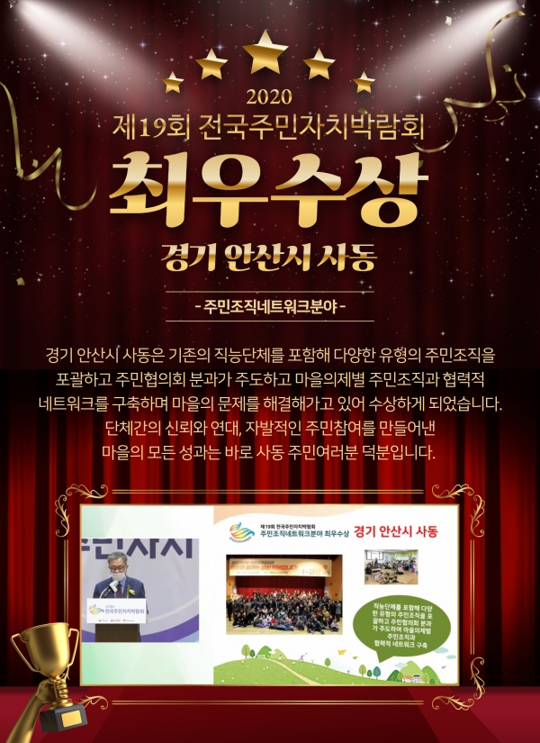 10년의 마을공동체 활동을 통해 주민자치의 새로운 사례를 만들어가고 있는 안산시 사동이 제19회 전국주민자치박람회에서 주민조직네트워크분야 최우수상을 수상했다. 사동은 기존의 직능단체를 포함해 다양한 유형의 주민조직을 포괄하고 주민협의회 분과가 주도하고 마을의제별로 주민조직과 협력적 네트워크를 구축하며 마을의 문제를 해결해가고 있는 사례로 최우수상을 수상하였다.