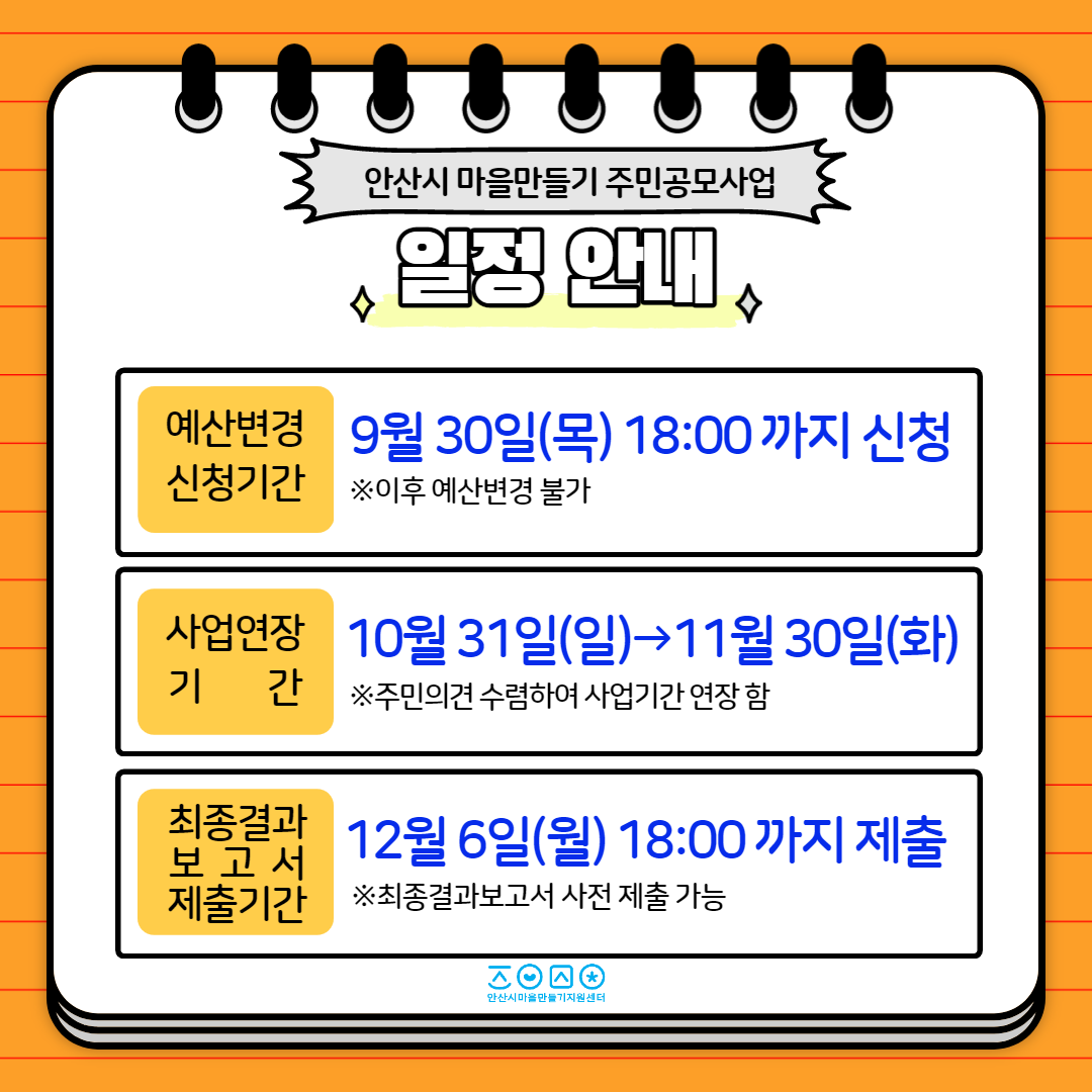 안산시 마을만들기 주민공모사업 기간이 10월 31일에서 11월 30일로 한 달 연장되었습니다.