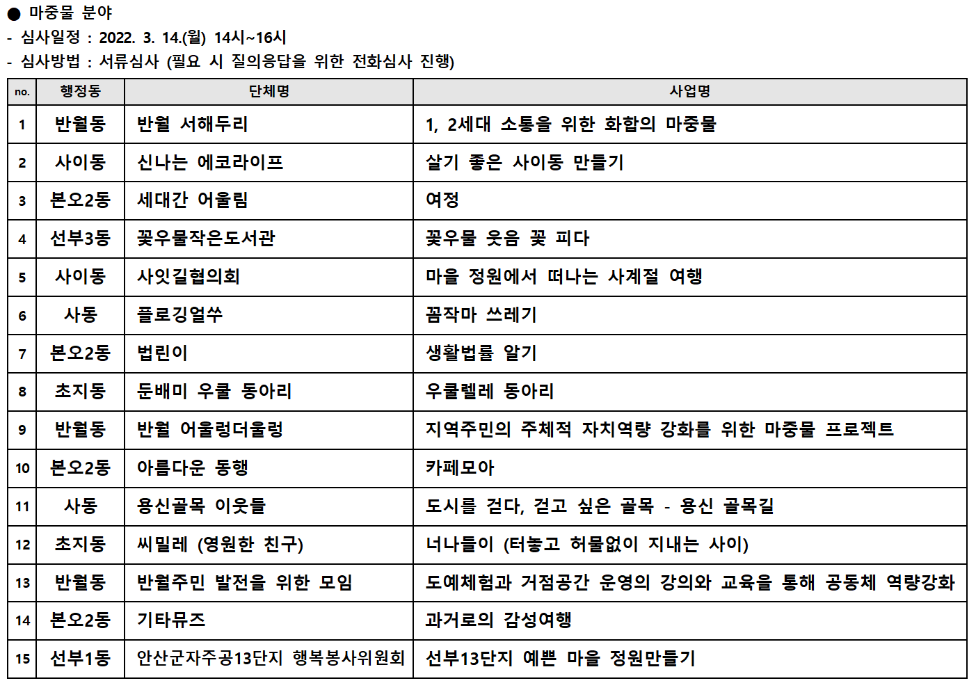 2022 안산시 마을만들기 주민공모사업 서류 심사 안내 [마중물 분야]