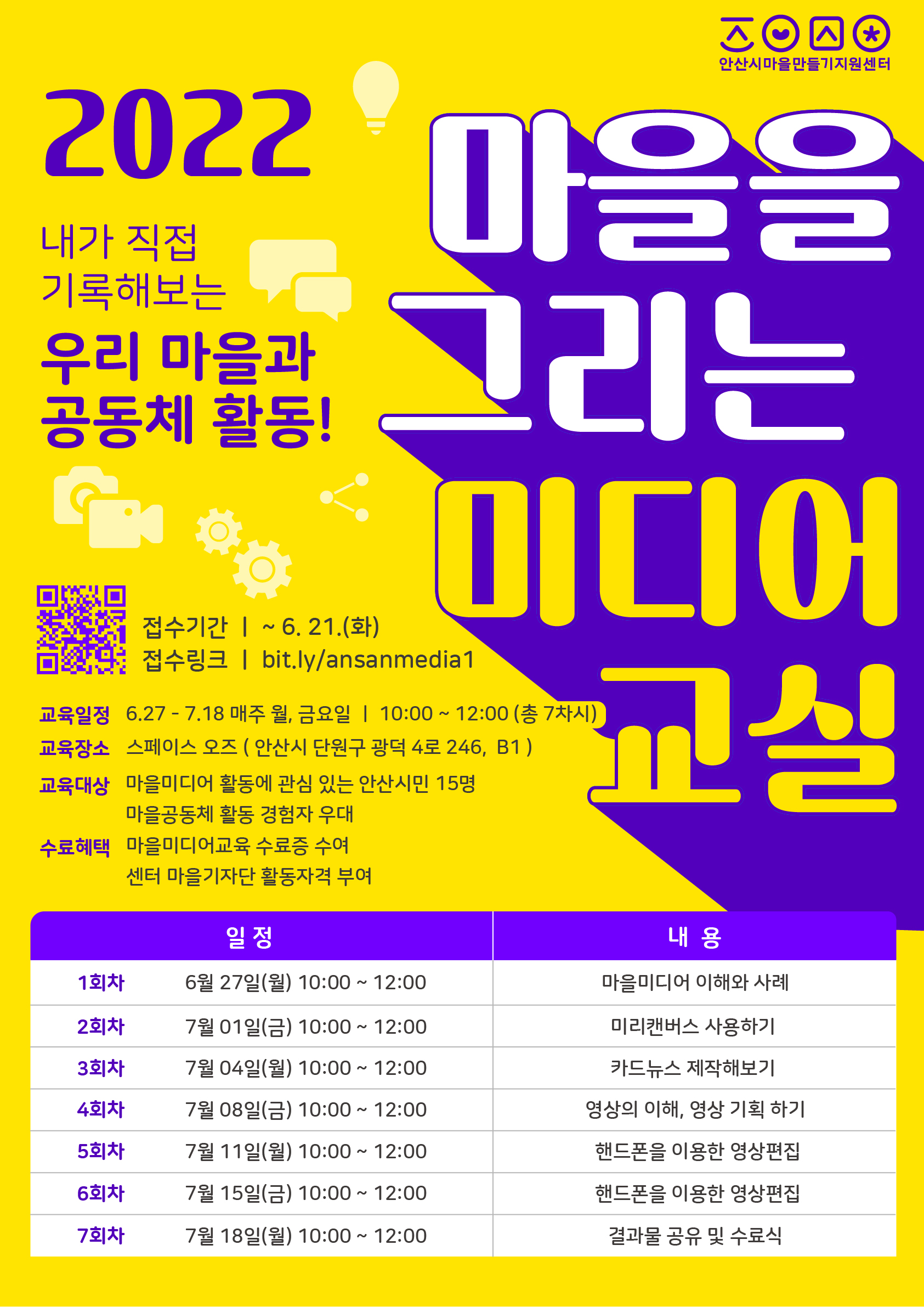 ● 수료혜택 : 마을미디어교육 수료증 부여, 안산시마을만들기지원센터 마을기자단 활동자격 부여