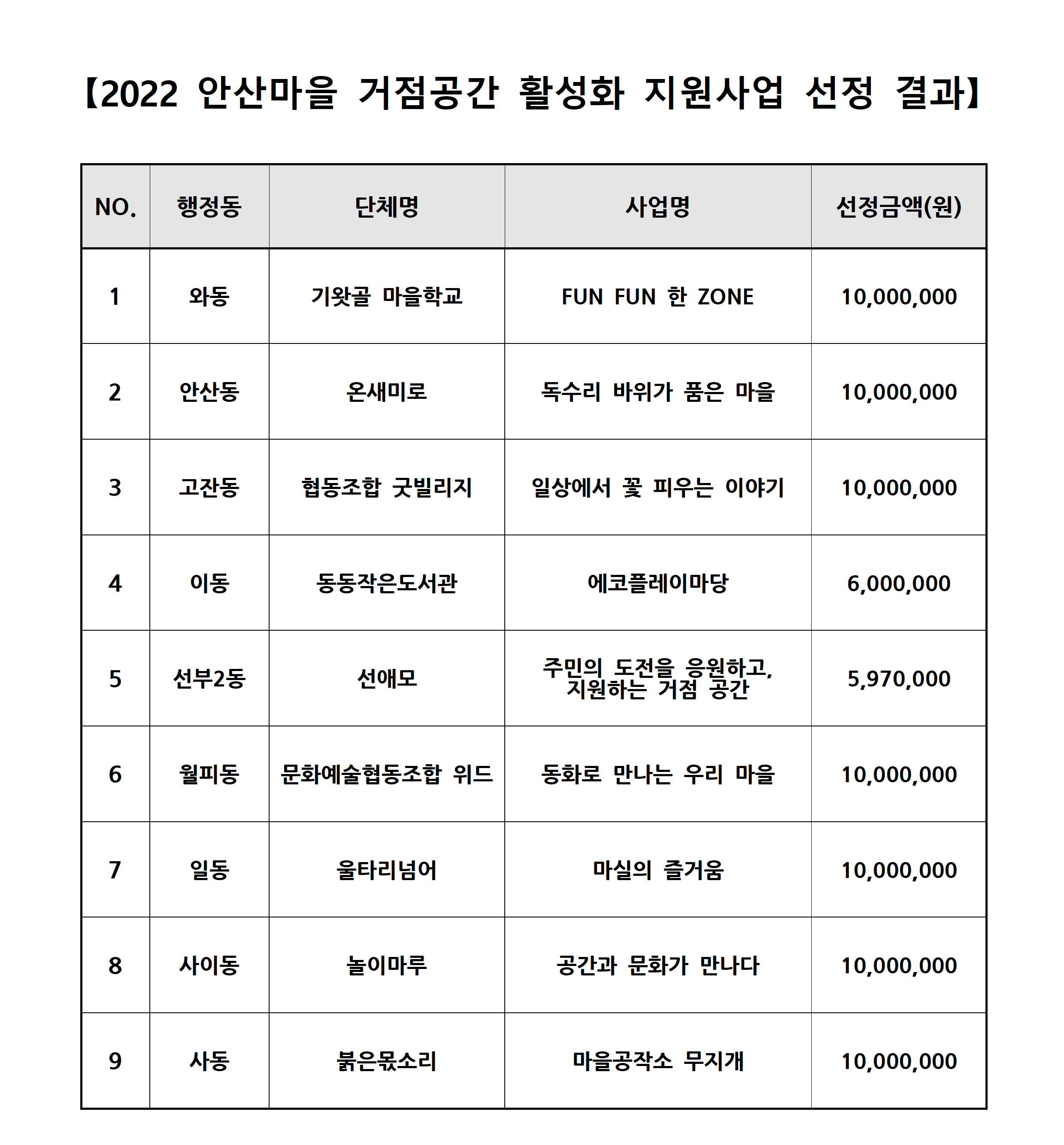 공고[2022-20호] 2022년 안산마을 거점공간 활성화 지원사업 선정결과 알림
