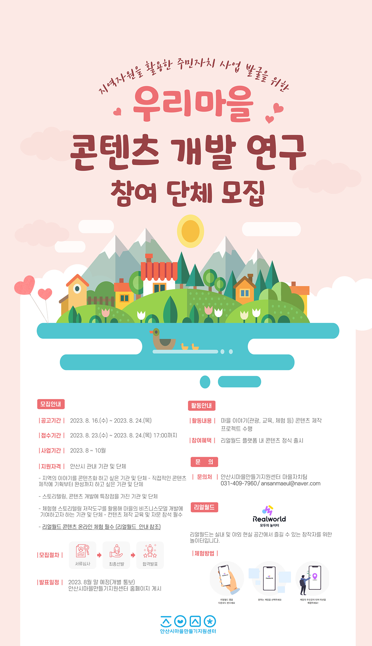- 체험형 스토리텔링 저작도구를 활용해 마을의 비즈니스모델 개발에 기여하고자 하는 기관 및 단체 ※ 콘텐츠 제작 교육 및 자문 참석 및 리얼월드 콘텐츠 온라인 체험 필수 (붙임_리얼월드_안내 참조)