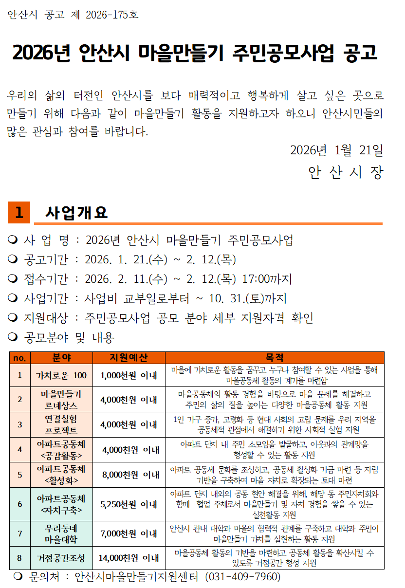 공고[2026-02호] 2026년 안산시마을만들기지원센터 「마을만들기 주민 공모사업」 공고