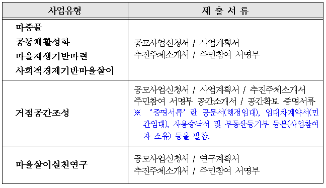 기 획 공 모 | 마을살이 실천연구 | 주민이 주도하는 마을만들기 및 향후 주민참여의 기회의 확장과 마을만들기의 정책 및 방향성을 함께 모색하기 위한 주민의 연구활동 지원 주민 3인 이상 마을의제 실현을 위한 기초조사 (예: 노인, 마을쓰레기 문제, 안전한 통학로, 주차 등) | 단체당 5,000이하 |