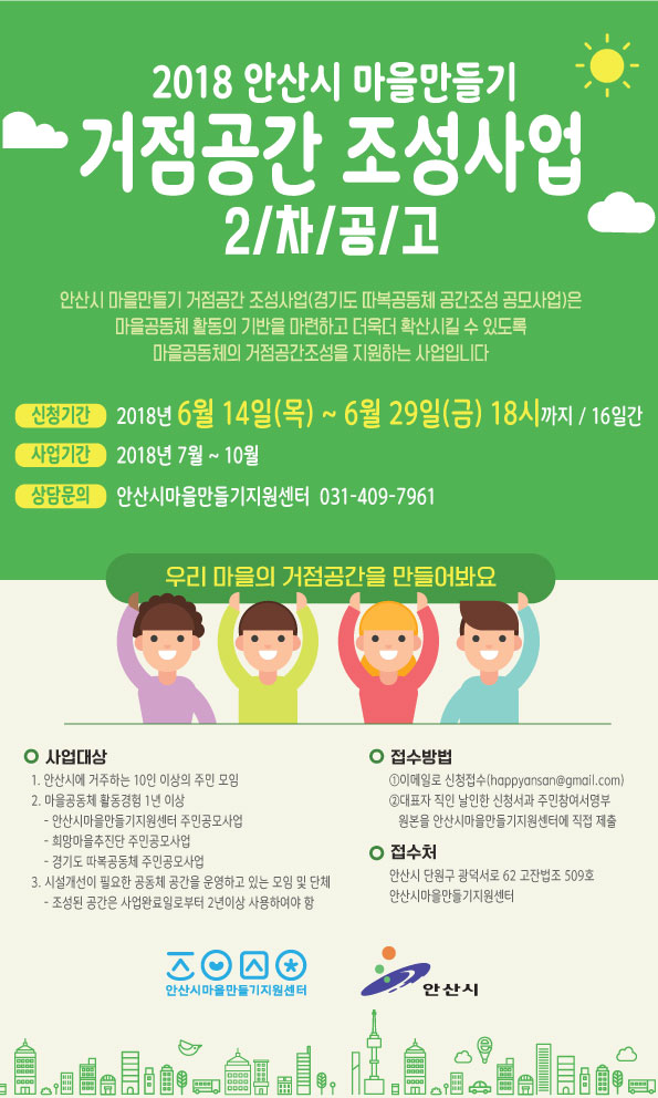 접수방법 : 이메일로 신청접수(happyansan@gmail.com)하시고 대표자 직인 날인한 신청서주민참여서명부 원본을 안산시마을만들기지원센터에 직접제출