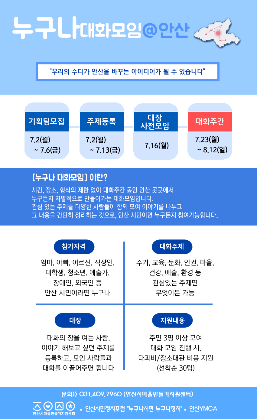 안산의 곳곳에서 시간, 장소, 형식, 인원수에 제한 없이 누구든지 자발적으로 만들어가는 대화모임입니다.
