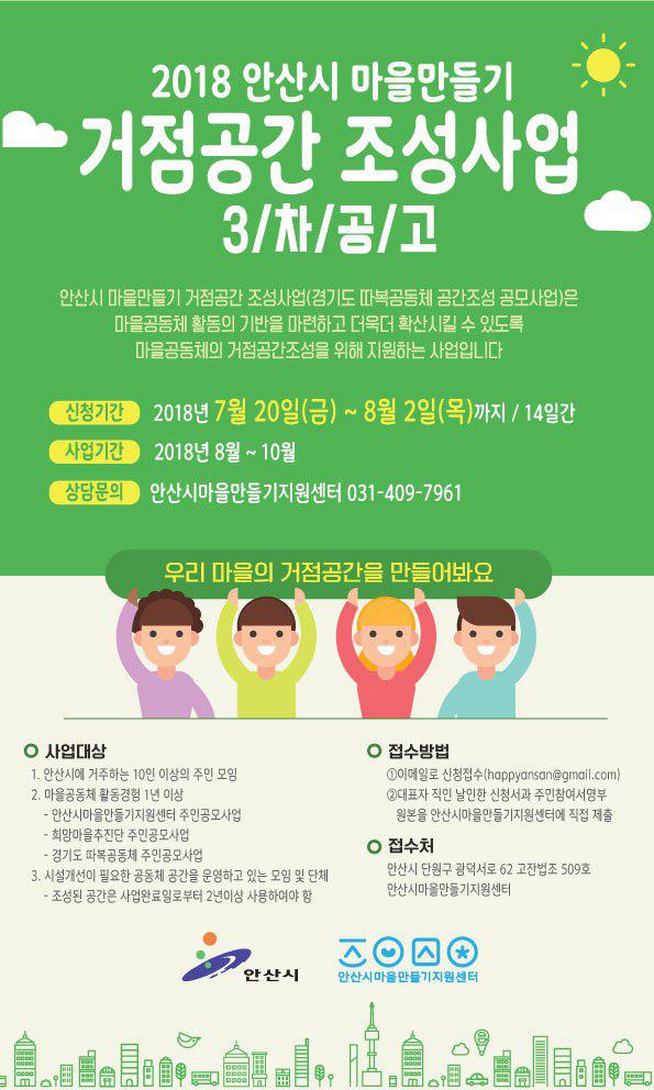 안산 마을공동체의 지속적인 추진과 확산을 위하여 마을만들기 거점공간 조성사업 3차공모 계획을 다음과 같이 공고하오니, 여러분의 많은 관심과 참여를 부탁드립니다.