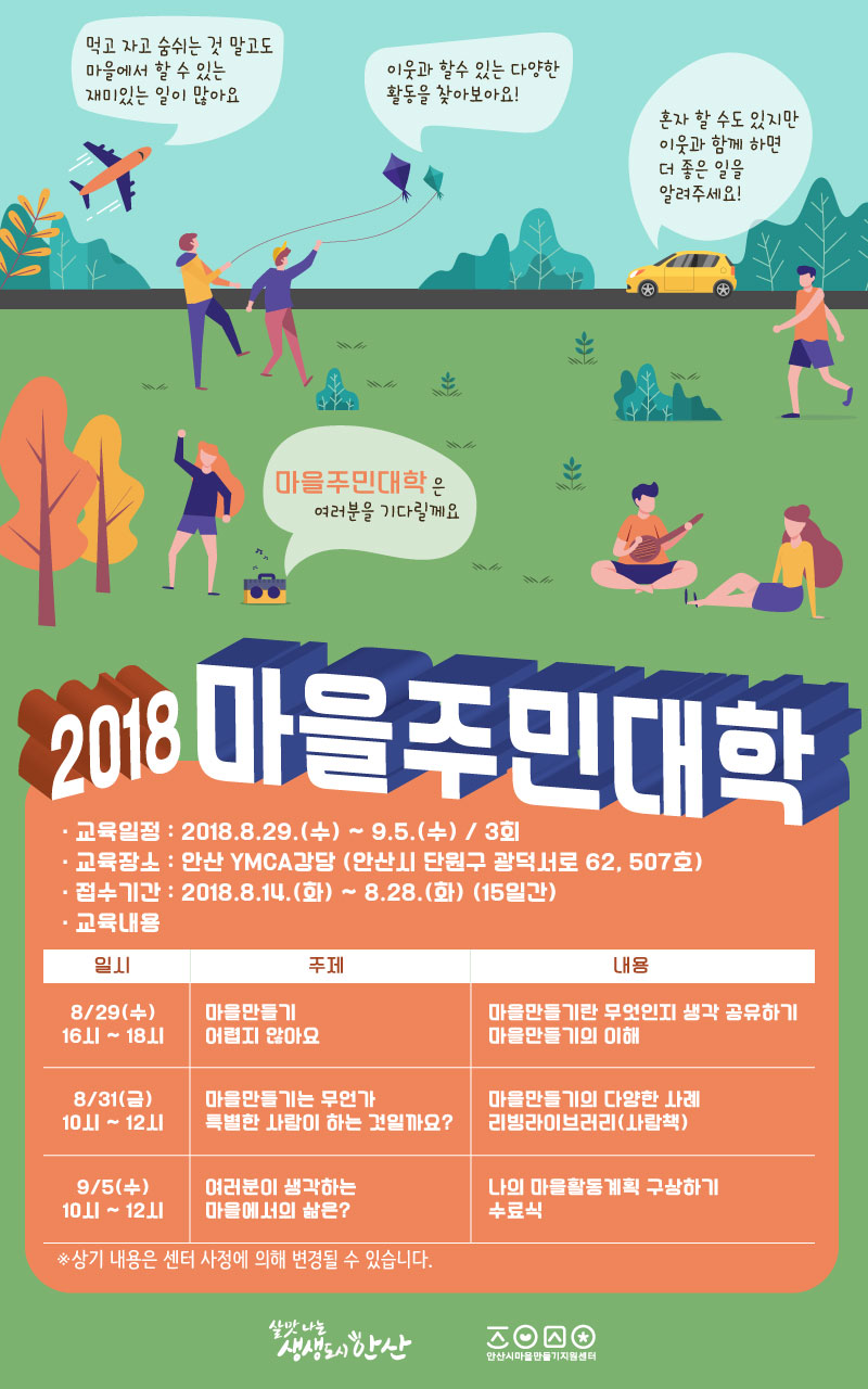 마을만들기를 잘 모르시거나 이제 막 활동 시작하신 분은 2018마을주민대학에 어서 신청해주세요~!