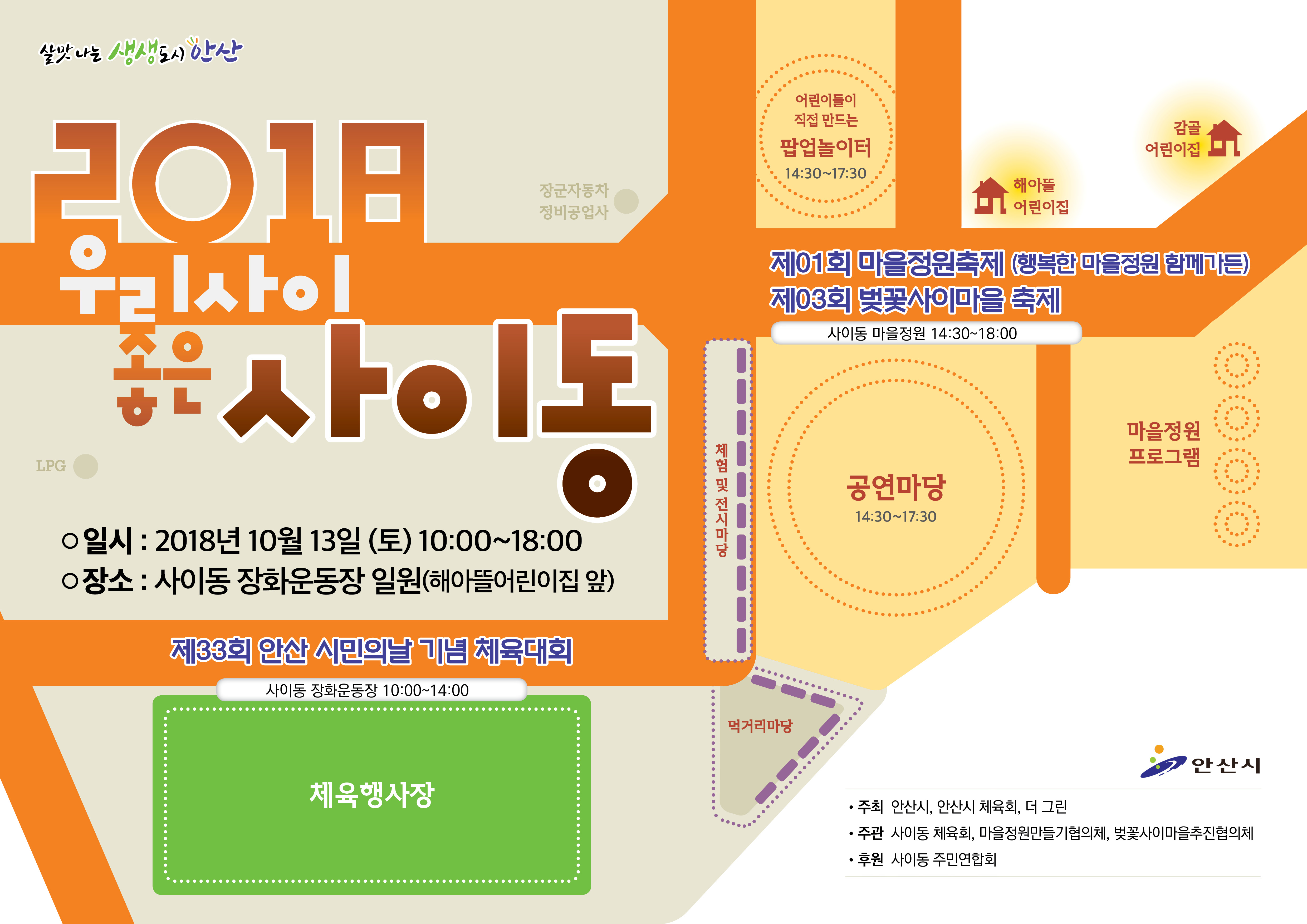 쌀쌀해진 가을~ 10월 13일 토요일에 사이동 장화운동장 일대에서 마을 축제를 합니다! 이번 축제는 안산 시민의날 기념 체육대회, 마을정원축제, 벚꽃사이마을축제 연합으로 진행합니다~