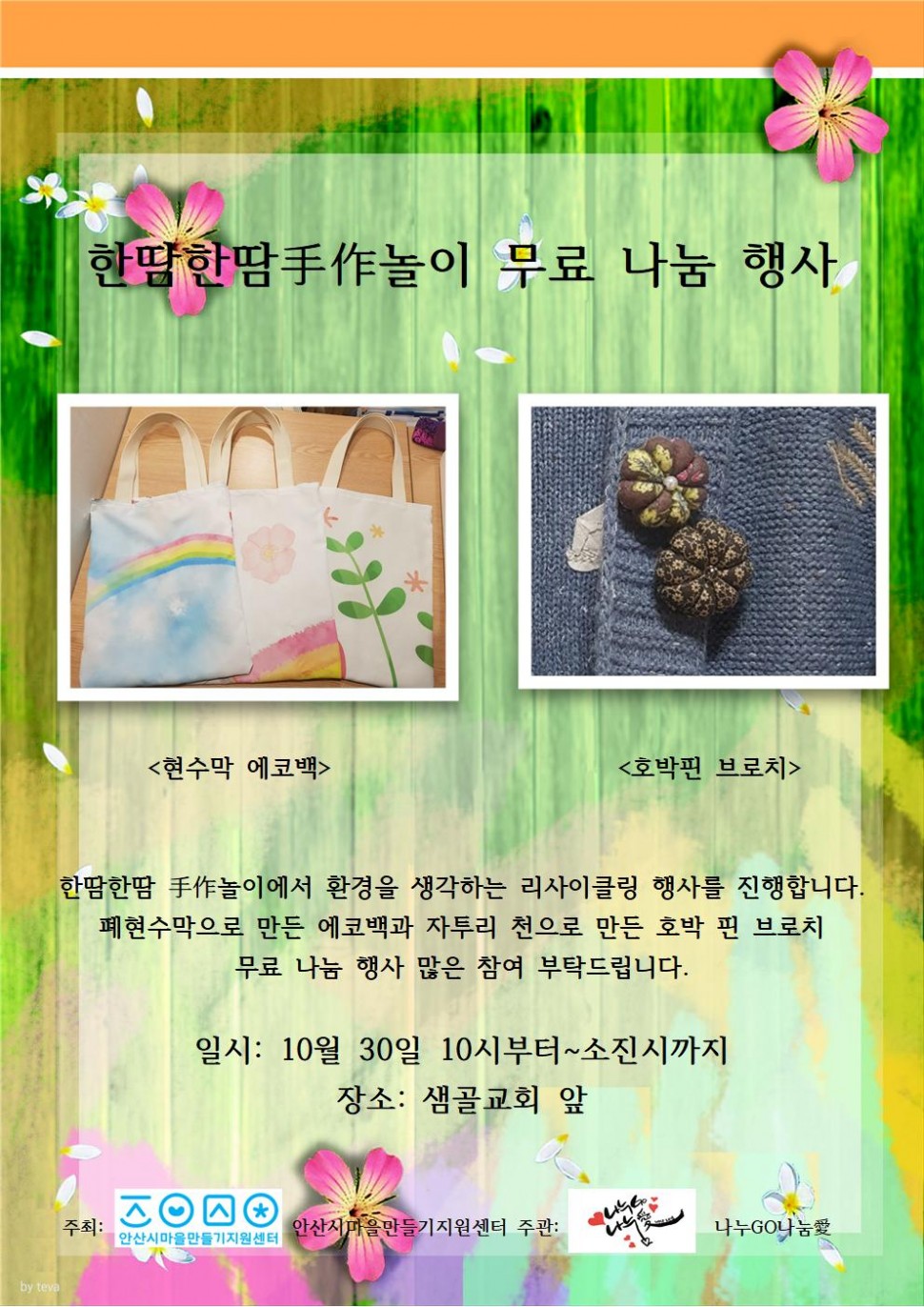 -샘골교회 어머니기도회에서 나눔 행사 시 호박 쿠션 만들기에 재능 기부를 함께 해주시고. 매 사업 진행 시 많은 관심을 가짐으로 마을 주민 뿐 아니라 주변 인근 지역으로까지 안산시마을만들기지원센터에 대해 홍보를 하게 됨