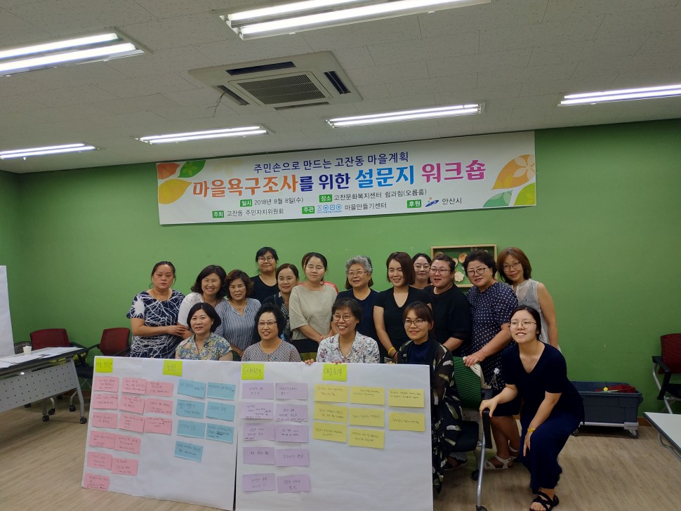 ○ 추진실적 · 마을계획을 위한 6개 영역주민 분과 구성 - 마을환경분과 (마을 환경에 대한 문제를 인식하고 해결하고자 하는 주민10명) - 아동. 청소년 분과(아동과 청소년이 살기 좋은 고잔을 만들고자 하는 주민10명) - 노인분과(어르신이 살기좋은 고잔을 만들고자하는 주민10명) - 도시미래분과(고잔의 역사를 잇고 아름다운 마을 미래를 만들고자 하는 주민 10명) - 마을회복분과 (416참사가 남긴 생명과 안전의 마을로 성장해야 하는 필요성을 공유하는 주민 10명) · 분과 활동 워크샵을 통한 주민 의견 조사 및 의제 선정 - 분과 토론 및 전체 의견 나눔으로 마을에 필요한 키워드 선정 - 6개 영역, 25개 분야, 37개 항목의 주민욕구 조사 설문지 제작 - 5개 영역 의제 선언문 제작 및 마을 대표 선언식 추진 ○ 사업효과 · 6개 영역 분과 구성 및 참여 주민 조직을 통해 고잔동의 문제의식과 해결에 대한 주민의견을 체계화 · 분과별 키워드 작업을 통해 주민 욕구조사의 기초가 되는 주민의견 조사 설문지를 구성하고 분과실천주민들이 주민들과 대면하여 설문조사 추진 · 설문조사 과정에서 주민 개인의 의견을 인지하여 창조적인 분과 실천대안이 도출 (8-6쓰레기 배출시간, 쓰레기 배출장소를 예쁘게 ; 한뼘갤러리 등) · 의제선포식을 준비하는 과정에서 주민과 함께 주민의 수준에서 공유할 수 있는 홍보 사업 추진 (여러개의 의제가 모여 살기좋은 마을 만들기 : 5가지 의제 비빔밥 나누기 “밥먹고 합시다” · 주민의 손으로 만드는 마을계획 의제선포식을 통해 마을축제에 최다 주민 참여 |