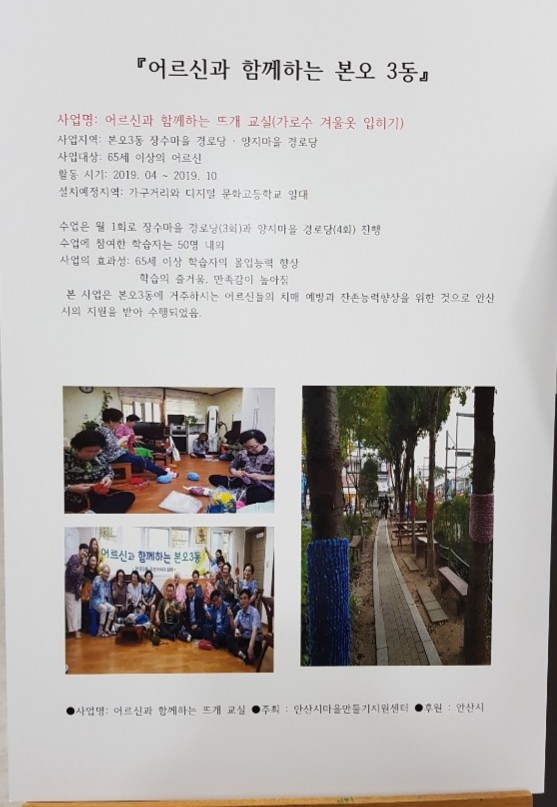 본 활동은 본오동 장수마을, 양지마을 어르신을 대상으로 하는 치매예방 사업으로 지역사회의 활용가능한 인적자원을 확보하여 어르신들의 정신건강 증진 및 문제점을 보완하기 위한 것으로, 주민 참여운동의 성격을 지닌다 본 사업에서 기대하는 긍정적인 측면은 다음과 같다. 첫째, 뜨개질을 이용하여 어르신들의 말단부위신경을 자극하고 뇌의 활성화를 돕는다. 둘째, 치매안심 마을로 정착하기 위하여 본 활동을 지속적으로 유지한다 |