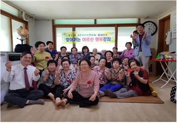 경로당 어르신들에게 손뜨개 카네이션을 달아드리고 손뜨개 수세미를 나누면서 마을 주민들 간의 이웃사랑이 서로 전달됨.