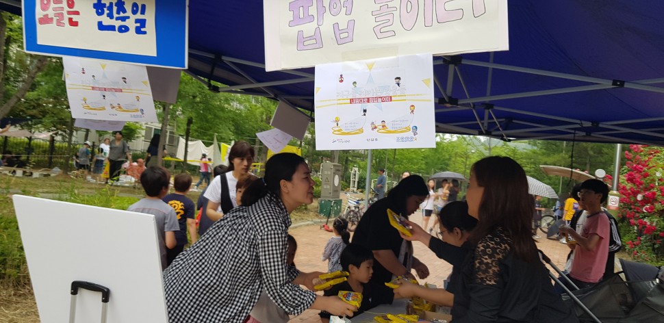 ○ 지구를 구할 영웅들 - 환경을 고려하는 활동을 위해, 생태탐방을 다녀오고, 친환경소품만들기로 주민과 나누며, 폐지를 활용한 팝업놀이터를 기획하여, 센터에서 소개받은 놀이기획자와 협업하고, 여섯 개의 부스를 꾸려서, 아이들의 반응이 좋았으며 사전에 두달 간의 환경퀴즈맞추기 캠패인으로 팝업놀이터 쿠폰을 나눠주어 자발적 참여가 많았습니다. ○ 주민과 아이들이 함께 열어가는 건강한 문화생활 - 아이돌봄활동으로 전통퓨전놀이를 기획, 아이돌봄자에게 할당된 다양한 연령대의 아이들을 고려하여 주변에 바닥에 마음껏 그림을 그릴 수 있도록 전지를 준비하여, 종이접기가 싫은 아이들은 자유롭게 다른 활동이 가능했습니다. |
