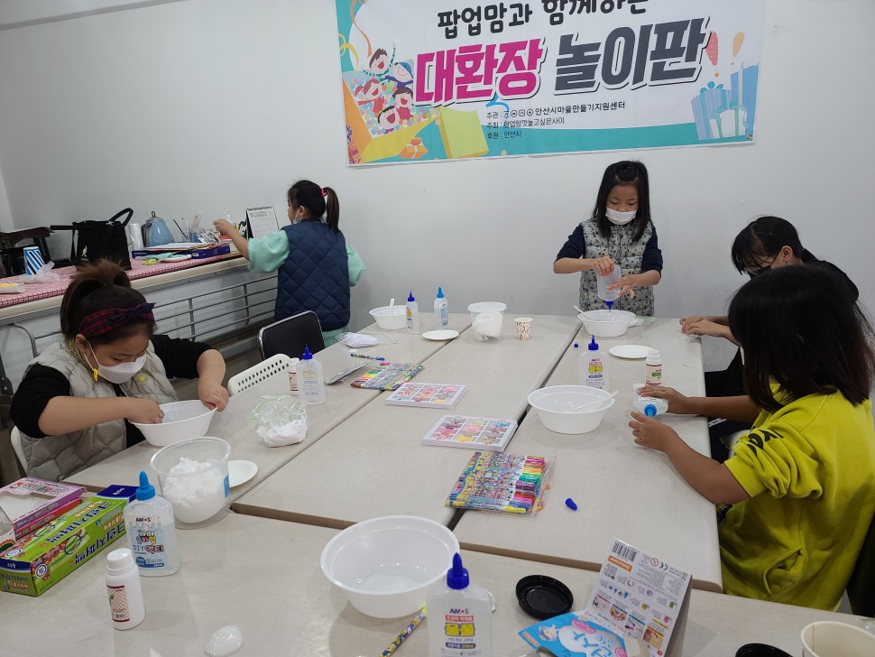 - 키트와 재활용품, 망가진 장난감들을 접목하여 새로운 장난감이 만들어지는 과정을 함께 하였고,유투브에서만 보던 슬라임 만들기를 세상에 하나밖에 없는 나만의 슬라임 만들기로 어린이들의 성취감 이 올라갔습니다.