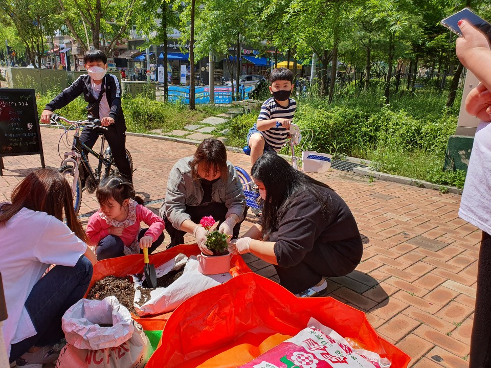 1. 상쾌한 5월, 집에서 잠자고 있는 화분을 가지고 오시면 미니장미, 제라늄, 로즈마리, 구문초 모종 중 하나를 선택해서 직접 심을 수 있도록 함