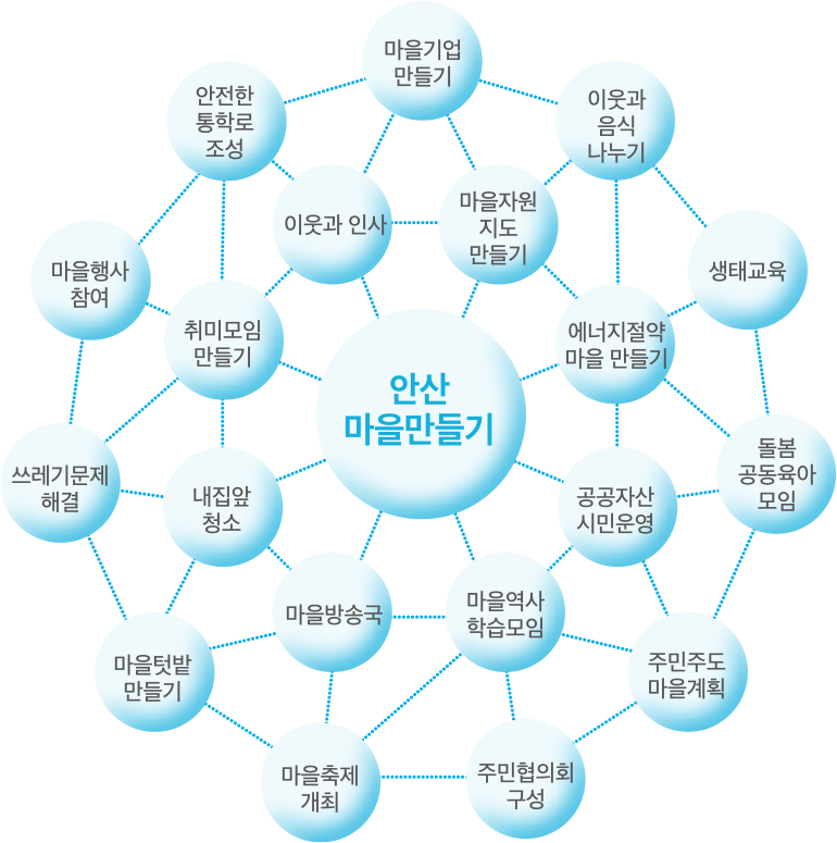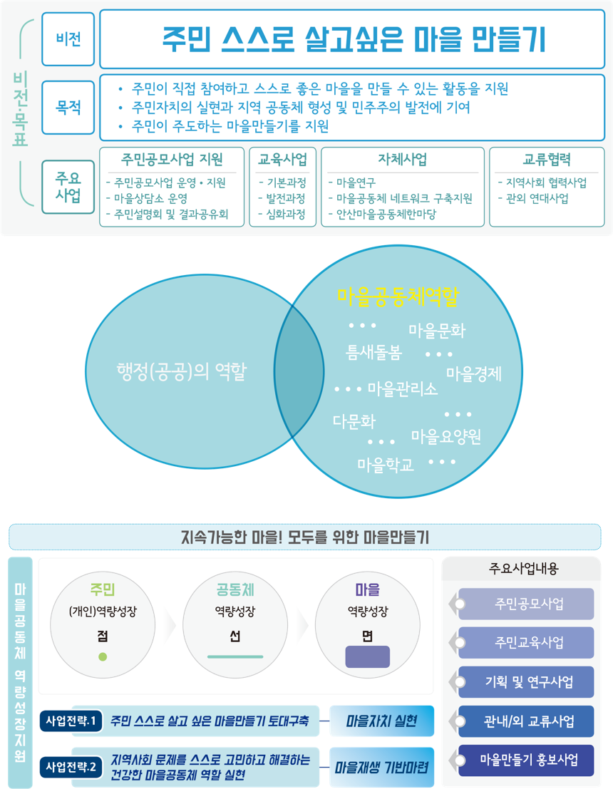 비전 주민 스스로 살고싶은 마을 만들기 목적 • 주민이 직접 참여하고 스스로 좋은 마을을 만들 수 있는 활동을 지원 • 주민자치의 실현과 지역 공동체 형성 및 민주주의 발전에 기여 • 주민이 주도하는 마을만들기를 지원 주요 사업 주민공모사업 지원 - 주민공모사업 운영•지원 - 마을상담소 운영 - 주민설명회 및 결과공유회 자체사업 - 마을연구 - 마을공동체 네트워크 구축지원 - 안산마을공동체한마당 교류협력 - 지역사회 협력사업 - 관외 연대사업 행정(공공)의 역할 마을공동체역할 마을문화, 틈새돌봄, 마을관리소, 마을경제, 다문화, 마을요양원, 마을학교 지속가능한 마을! 모두를 위한 마을만들기 마을공동체 역량성장지원 주민역량 성장 역량성장 점 공동체 역량성장 선 마을 역량성장 면 주요사업내용 주민교육사업 기획 및 연구사업 관내/외 교류사업 마을만들기 홍보사업 사업전략.1 주민 스스로 살고 싶은 마을만들기 토대구축 - 마을자치 실현 사업전략.2 지역사회 문제를 스스로 고민하고 해결하는 건강한 마을공동체 역할 실현 - 마을재생 기반마련